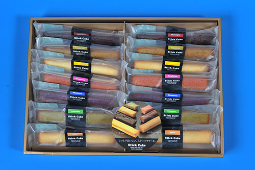 しっとりとした食感のフィナンシェ生地をスティック型で焼成しています。プレーン・チョコ・ラズベリー・チーズ・ブルーベリー・ピスタチオ・レモンティーの7つの味が楽しめます。