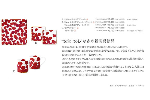 世界最高レベルの鮮やかさノリタケが新たに開発した赤絵の具はセレン・カドミウムを含まないものとしては、世界最高レベルの鮮やかさになります。「ROSA ROSSA」とは、イタリア語で赤いバラの意味。赤いバラには、愛、美、情熱といった花言葉があり、愛する人へ贈る花としても定番です。そんな赤いバラに秘められた想いを無数の花びらを大胆に散りばめることでドラマティックの表現しました。特別な日に使いたい、大人のためのエレガントなテーブルウエアです。